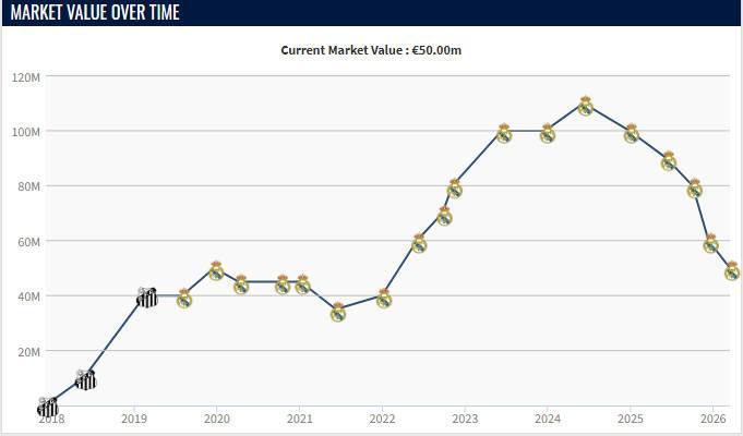 但在姆巴佩加盟球队之后,罗德里戈在球队中的重要性下降,上赛季开始,他的身价开始下滑,2024年12月跌至1亿欧元,2025年6月跌至9000万欧元,10月下降至8000万欧元,12月跌至6000万欧元,而今年3月则下降至5000万欧元。